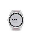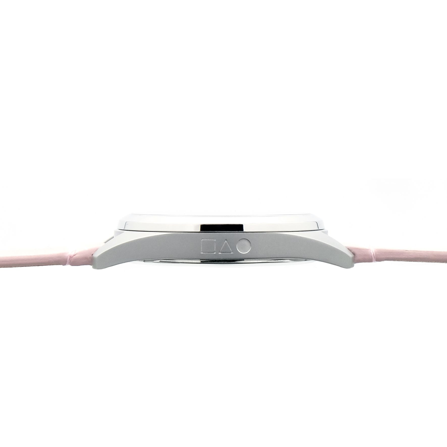 Ich bin mit einem rosefarbenen Lederarmband ausgestattet